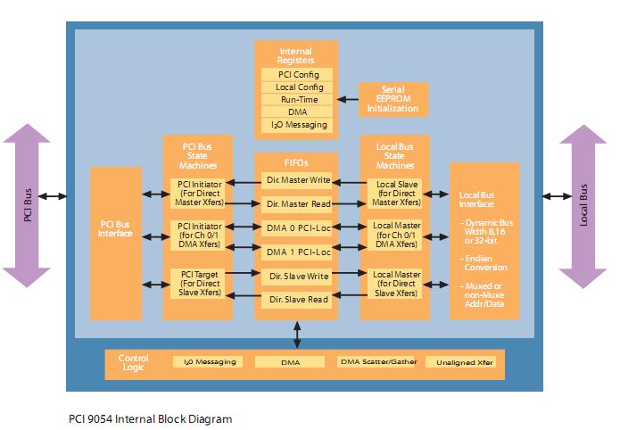 PCI9054 features: (1)PCI v2.2 Power Management Spec compatible ; (2)PCI v2.2 Vital Product Data(VPD) configuration support; (3)PCI Dual Address Cycle (DAC) support; (4)Programmable Interrupt Generator; (5)Programmable Burst Management; (6)Supports Type 0 and Type 1 Configuration Cycles; (7)Supports Local Bus Direct-Connect to MPC 850/860 PowerQUICC, Intel i960, and IBM PPC 401 CPUs and similar bus protocol devices; (8)3.3V, 5V Tolerant PCI signaling supports Universal PCI Adapter designs; (9)Flexible 3.3V, 5V Tolerant Local Bus operation up to 50MHz; (10)32-Bit Multiplexed, or Non-Multiplexed Local Bus Supports 8-, 16-, and 32-Bit Peripheral and Memory devices; (11)CompactPCI Hot Swap Friendly; (12)I2O v1.5 Ready Messaging Unit; (13)Industrial Temp Range Operation; (14)3.3V CMOS in 176-pin PQFP or 225-ball PBGA packages; (15)PCI v2.2 compliant 32-bit 33MHz Bus Master Interface Controller enables PCI Burst Transfers up to 132Mbytes/second; (16)General Purpose Bus Master Interface featuring an advanced Data Pipe Architecture which includes two DMA engines, programmable Target and Initiator data transfer modes and PCI messaging functions.